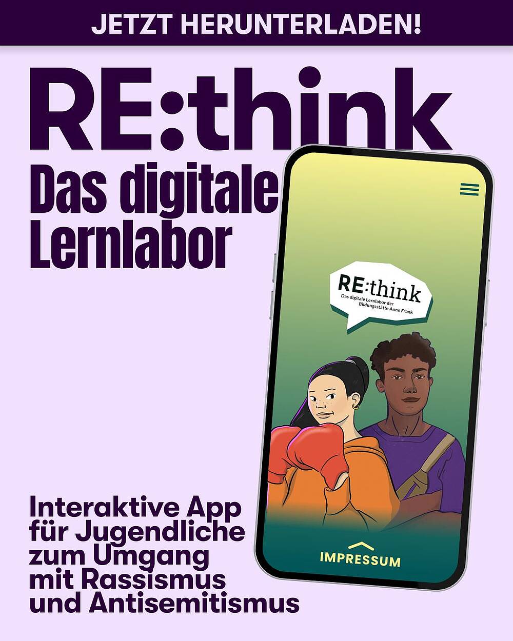 Die Bildungsstätte Anne Frank stellt mit der App „RE:think“ ein digitales Lernlabor bereit, das Jugendlichen den Zugang zu gesellschaftspolitischen Themen erleichtert und beim Umgang mit Rassismus und Antisemitismus unterstützt. Lehrkräfte können die App im Unterricht einsetzen. Mehr