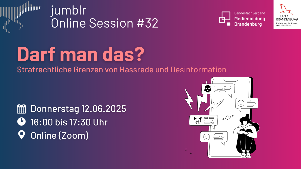 Der Landesfachverband Medienbildung Brandenburg veranstaltet am 12. Juni die jumblr-Session #32: Darf man das? Strafrechtliche Grenzen von Hassrede und Desinformation. Die Veranstaltung bietet Einblicke in rechtliche Fragen, aber auch wie man Haltung zeigt, Orientierung gibt und Betroffene stärkt. Die Teilnahme ist kostenfrei und eine Anmeldung nicht erforderlich.