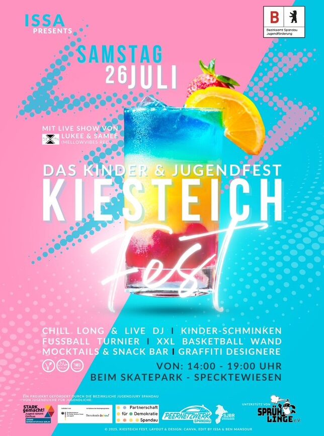 Sommer - Sonne - Kiesteich Fest. Die Jugendlichen der Sprühlinge e.V. wollen mit dem Kiesteich Fest ein Zeichen für mehr Freizeitangebote im Ortsteil Falkenhagener Feld setzen. Eingeladen sind alle Kinder, Jugendlichen und Familien.